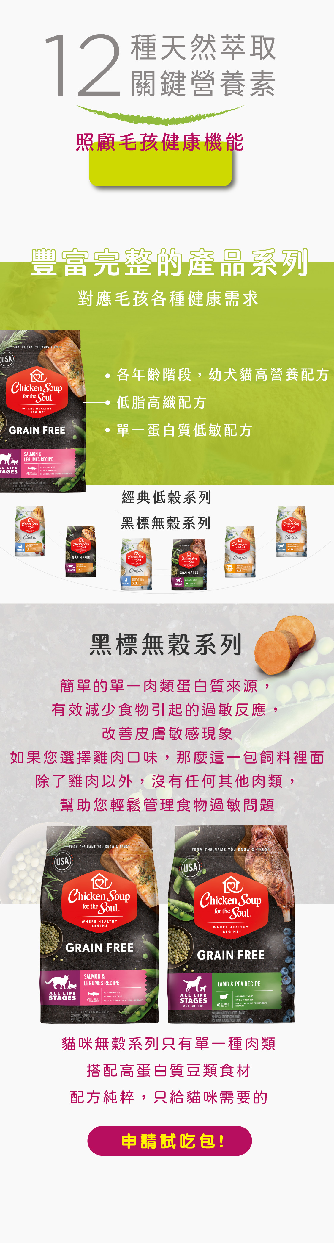 新鮮雞肉,雞肉粉,豌豆,扁豆,田豆,豌豆粉,雞肉脂肪(與綜合生育酚混合保存),亞麻籽粉,甜薯,天然香料,磷酸氫鈣,鮭魚油(與綜合生育酚混合保存),天然鹽,碳酸鈣,氯化膽鹼,菊苣根,覆盆子,西紅柿,藍莓,牛磺酸,混合生育酚(天然防腐劑),檸檬酸(天然防腐劑),蛋白鋅,氧化鋅,維生素E,絲蘭萃取物,硫酸亞鐵,氧化錳,錳蛋白,硫酸銅,維生素A,D-泛酸鈣,菸鹼酸,亞硒酸鈉,銅蛋白酶,核黃素,碘酸鈣,嗜酸乳桿菌發酵物,酪乳桿菌發酵物,植物乳桿菌發酵物,屎腸球菌酵產物,維生素B1,維生素B6,維生素D3,碳酸鈷,葉酸,生物素,維生素B12,迷迭香萃取物